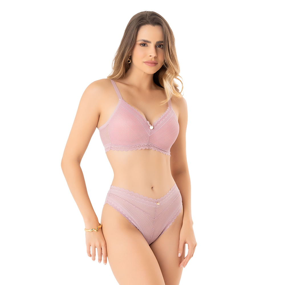 O Conjunto Soutien Moldado com Bojo + Calcinha Biquíni de Renda combina delicadeza, feminilidade e conforto em uma proposta elegante para o dia a dia ou momentos especiais.
