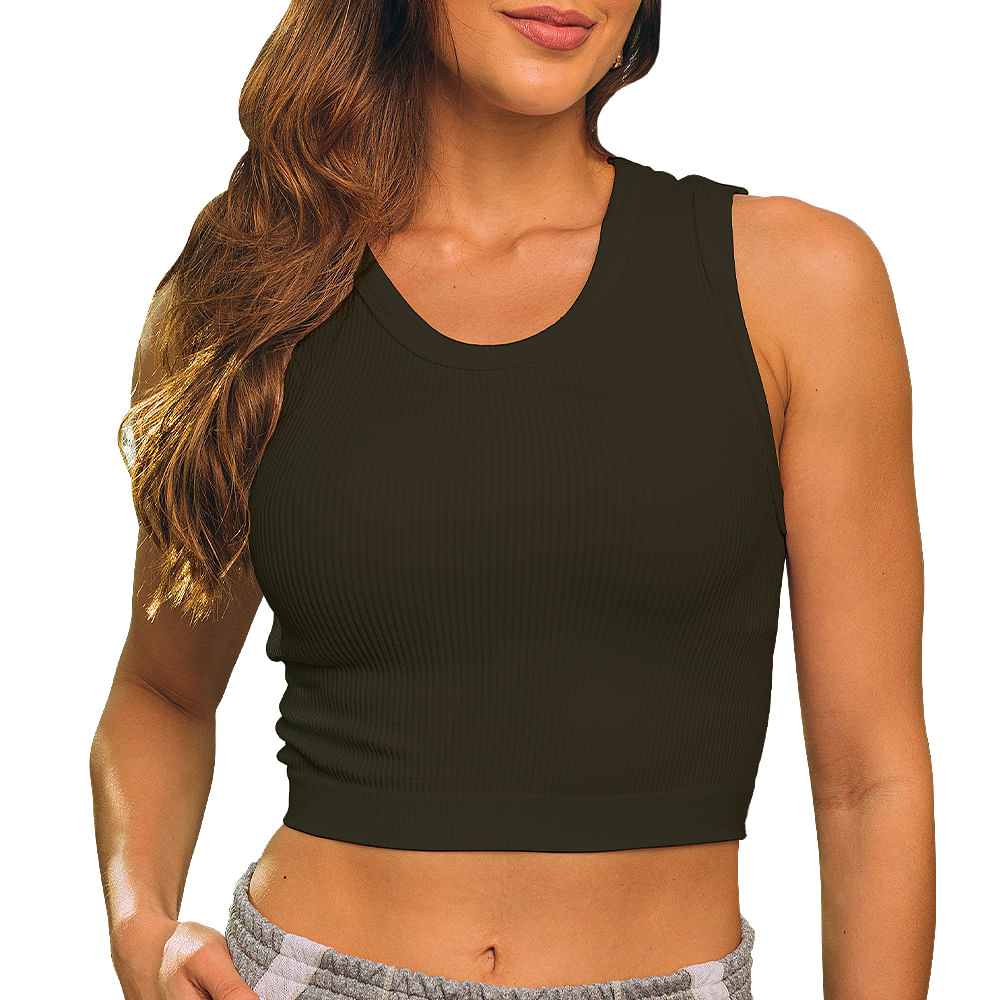 Confeccionada inteiramente em malha canelada através da tecnologia Seamless, essa peça ostenta um decote careca e um estilo regata.